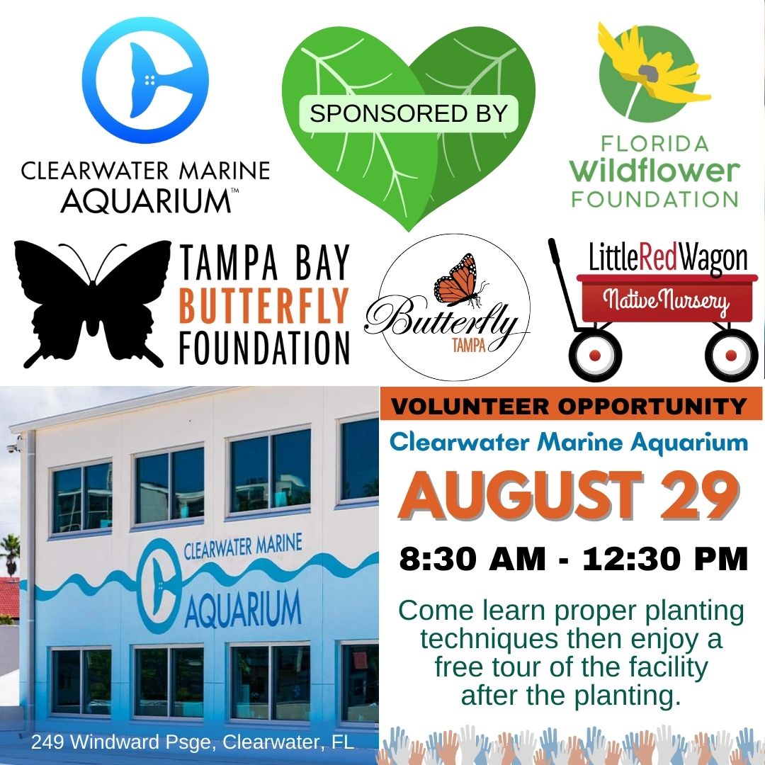 This is a great opportunity to learn proper planting techniques and learn about native plants. Volunteers are needed to assist with planting a butterfly garden sponsored by the Florida Wildflower Foundation, Tampa Bay Butterfly Foundation, Butterfly Tampa, Little Red Wagon Native Nursery and Clearwater Marine Aquarium at 249 Windward Psge, Clearwater, FL.